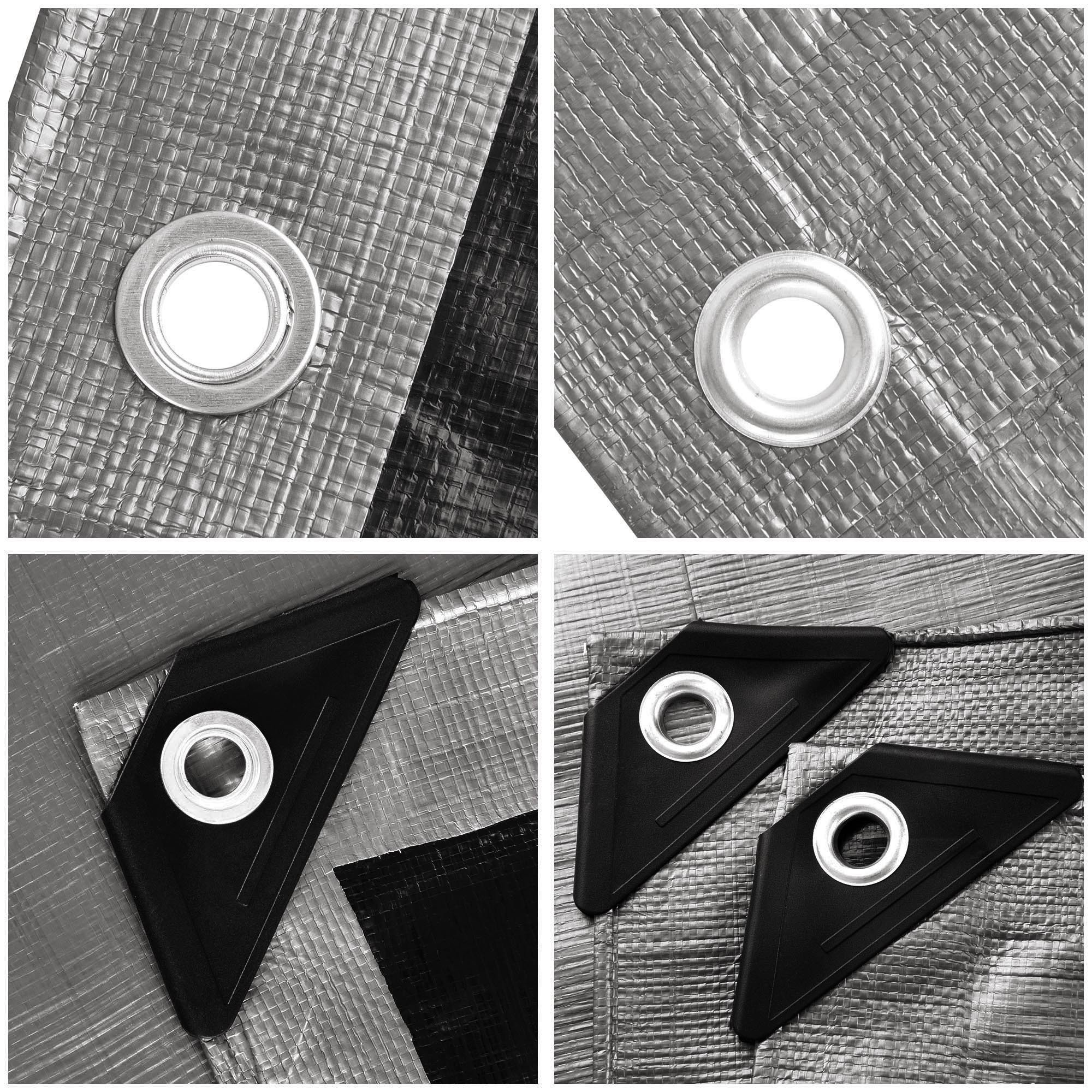 - Heavy Duty Sturdy Poly Tarp - Weights 20.37Lbs; 10mil heavy-duty thickness and aluminum grommets in 3 1/4 ft (1m) interval for better tear-resistance; PP plastics capped reinforced corners with grommets for sturdy construction; All seamless edges avoid water leakage