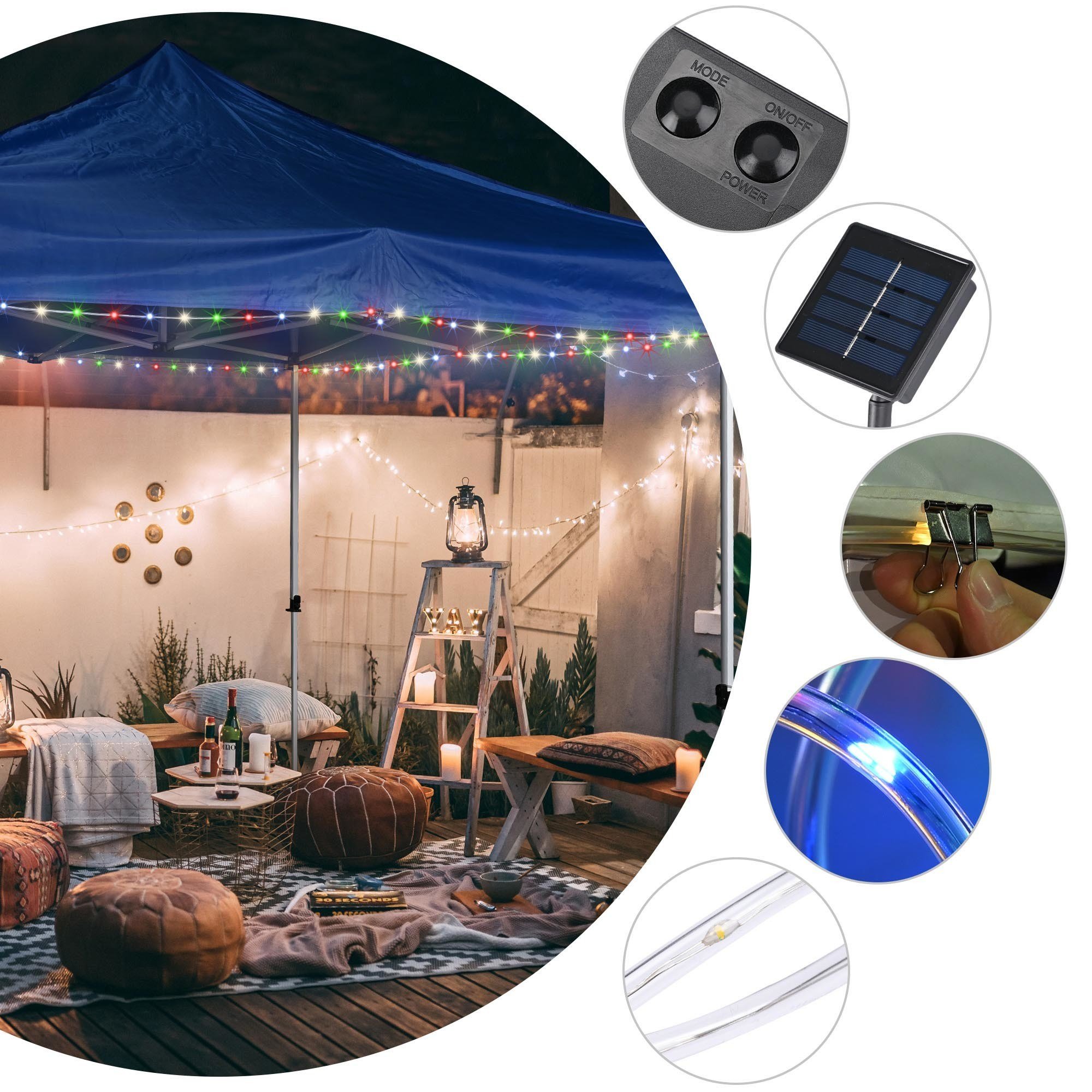 - Wide Application - 40 ft Solar Powered LED String Light fits up to 10x10 ft canopies; 120 RGB LED fairy lights to boost ambience fantastically; setting the mood for memorable night with friends & family over barbeque; wedding; tailgate party; yard; patio; beach; also perfect decoration for bicycle; Christmas tree; etc.