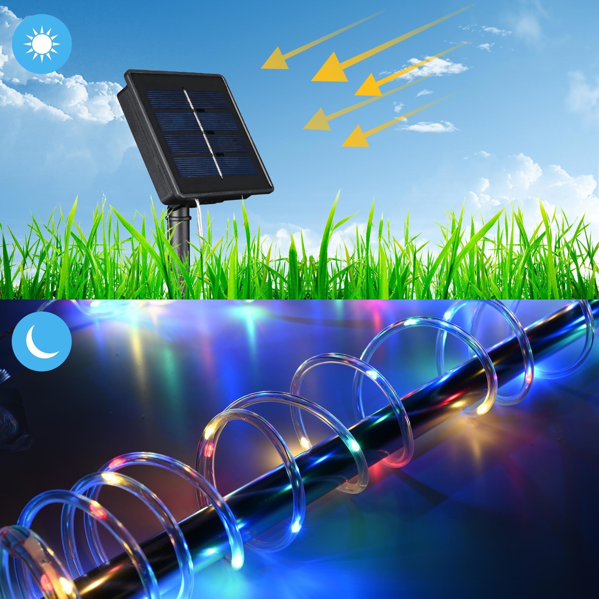 - Auto Charge & Light up - With solar panel to charge under sunlight at daytime & power lights at night; built-in light sensor turns on the lights automatically only at dusk or in dark environment & turns off at dawn; 1.2 V 800 mAh rechargeable battery to support continuous lighting up to 10 hours after fully charged